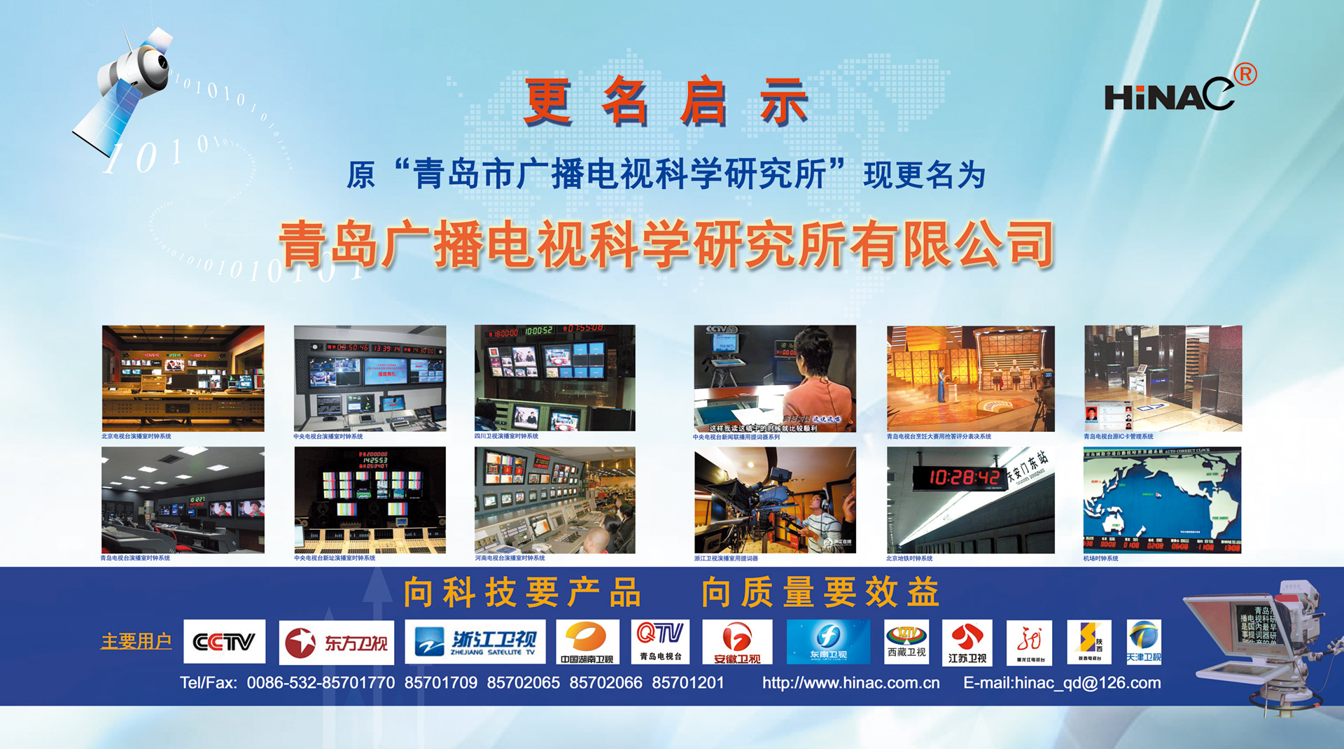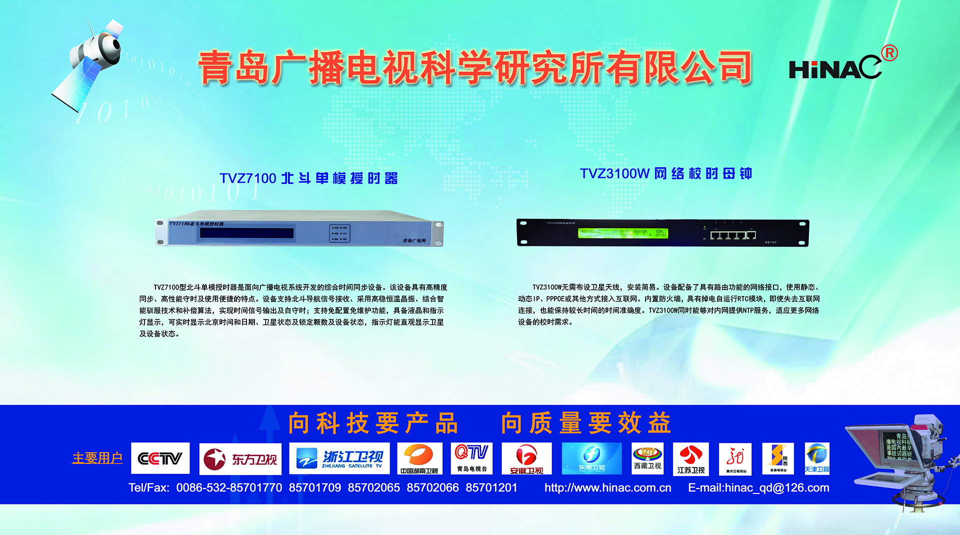 25年不悔的執(zhí)著追求! 25年不懈的專業(yè)堅(jiān)持! 青島廣播電視科學(xué)研究所有限公司(簡(jiǎn)稱青島廣電所)以其對(duì)廣電科技事業(yè)無(wú)限的熱愛(ài),以及為爭(zhēng)做中國(guó)最優(yōu)秀廣電產(chǎn)品供應(yīng)商的美好理想,25年如一日,深耕廣電設(shè)備這塊沃土,已經(jīng)形成且被市場(chǎng)高度認(rèn)可的成果有: TVZ系列GPS/北斗自動(dòng)校時(shí)鐘系統(tǒng) TC系列電視播音提詞器及電視直播系統(tǒng)整體解決方案 TL系列泰麗訊源指示系統(tǒng) QD系列搶答表決評(píng)分系統(tǒng) IC系列廣電一卡通管理系統(tǒng) 同時(shí)向:廣電設(shè)備集成商、地鐵輕軌信號(hào)系統(tǒng)設(shè)備供應(yīng)商及其它業(yè)務(wù)方向創(chuàng)新、拓展、前行! 青島廣電所在國(guó)家廣電傳媒事業(yè)不斷發(fā)展的今天,愿意和您攜手并進(jìn),為我們共同的事業(yè)發(fā)展添磚加瓦開(kāi)拓創(chuàng)新。愿意和您一道,把工作中的一個(gè)奇思妙想轉(zhuǎn)變?yōu)橐豁?xiàng)偉...